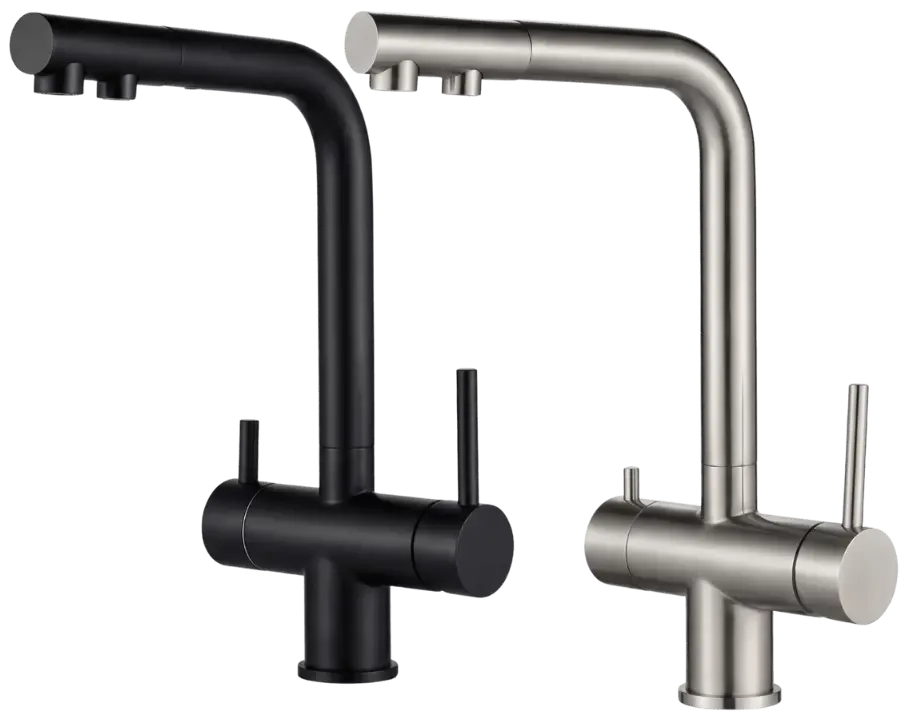 Die NORA 3-Wege-Armatur vereint Warm- und Kaltwasser mit einer separaten Leitung für gefiltertes Trinkwasser in einem eleganten L-Auslauf. Gefertigt aus massivem Edelstahl und ausgestattet mit ausziehbarer Brause, bietet sie maximale Flexibilität beim Spülen und Reinigen. Ideal für Küchen mit Trinkwasser- oder Umkehrosmosefiltersystemen. Erhältlich in Schwarz oder Edelstahl gebürstet.