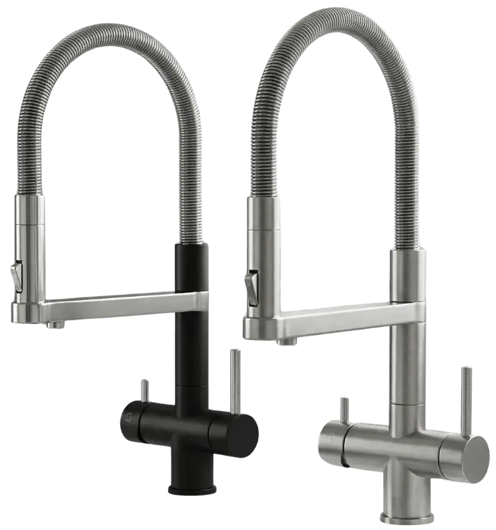 Warm- und Kaltwasser sowie stilles, still gekühltes und sprudelndes Trinkwasser aus einer einzigen Armatur. Die ALBA wurde speziell für den Einsatz mit Wassersprudelanlagen konzipiert und überzeugt mit flexibler Spiralfeder, umschaltbarem Brausekopf für Normal- und Duschstrahl sowie klar getrennten Wasserwegen.