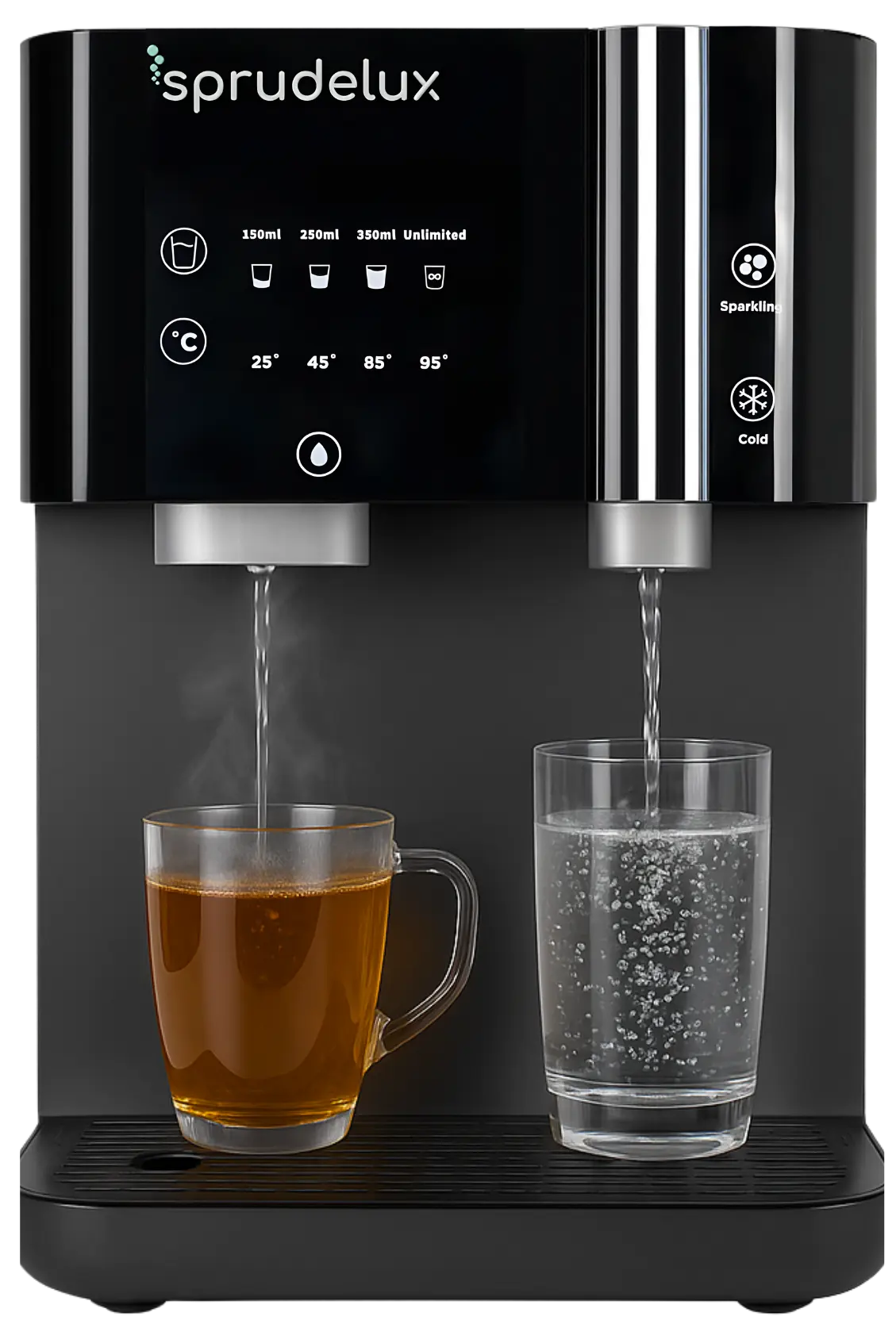Sprudelwasser, stilles, kaltes und heißes Wasser – alles in einem kompakten Gerät. Ideal für Tee, Kaffee oder gekühlte Erfrischungen.