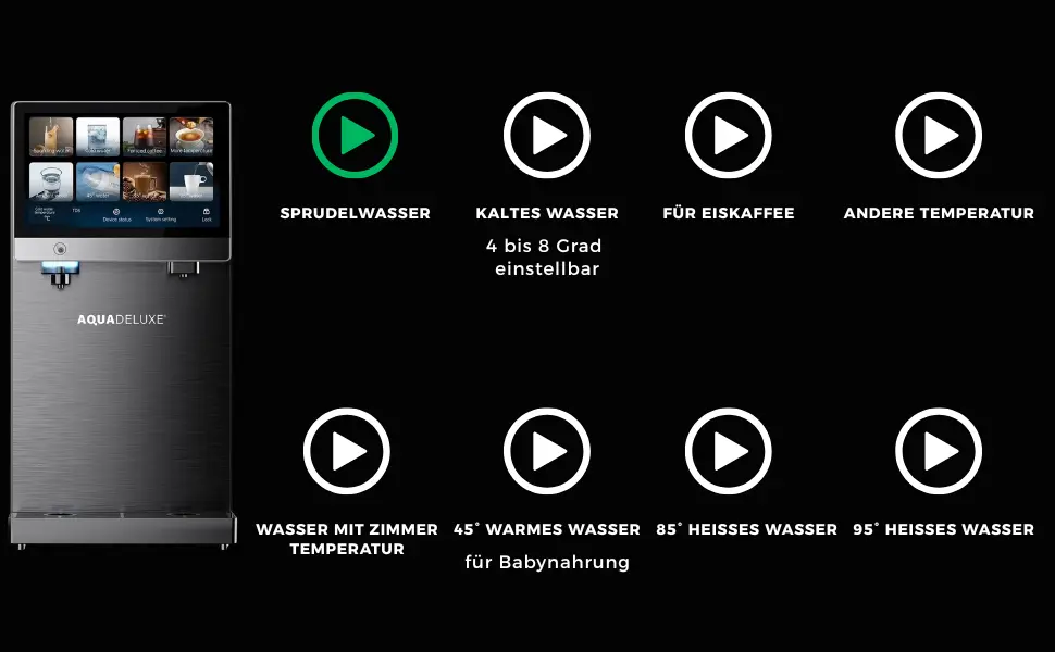 Der SPRUDELUX PRO TOUCH liefert gefiltertes, sprudelndes, heißes oder gekühltes Wasser auf Knopfdruck. Dank moderner 4-Stufen-Umkehrosmose mit UV-Desinfektion genießen Sie hygienisch reines Wasser jederzeit und überall. Mit Festwasseranschluss oder 5-Liter-Tank flexibel nutzbar – das elegante Touchdisplay macht jede Bedienung intuitiv, sicher und effizient.